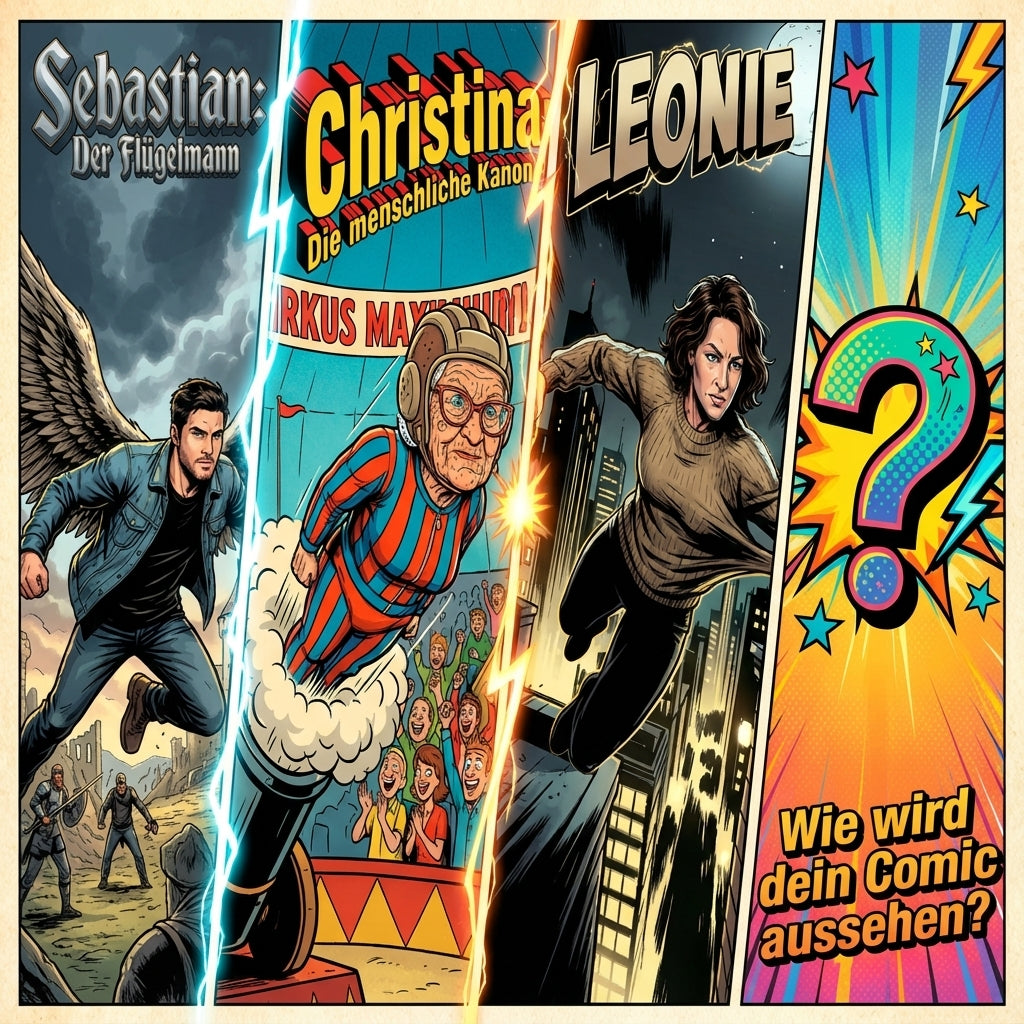 Verwandle deine Liebsten in die Stars ihres eigenen Comics! Ob deine Familie als unschlagbares Team, dein bester Freund als epischer Abenteurer oder dein Haustier als Retter der Galaxis. Bei MeComic wird jede deiner Geschichten zum farbenprächtigen Meisterwerk. Dein persönlicher Comic ist zum Greifen nah!